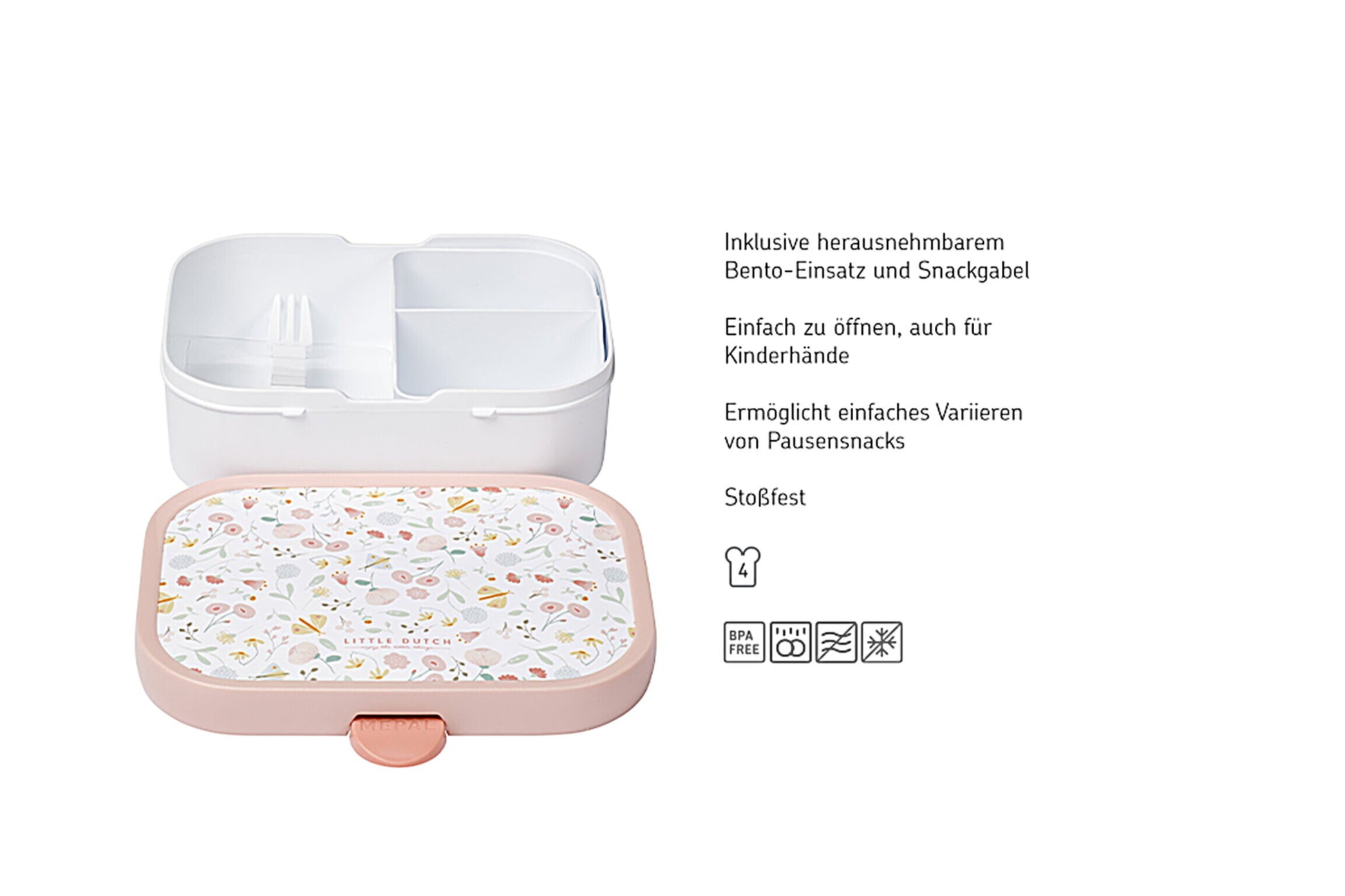 Möchten Sie für Ihr Kleines auch eine eigene Pausendose haben? Diese Mepal-Bento-Box Flowers & Butterflies eignet sich perfekt dazu, das Mittagbrot oder Snacks für Ihr Kleinkind unterwegs mitzunehmen. Ob es nun um Schule, Spielplatz oder einen Tag im Zoo geht, diese Lunchbox wird sich als praktisch erweisen und Ihr Sohn oder Ihre Tochter wird sie toll finden. Die Lunchbox kann dank der Bento-Box in drei Fächer eingeteilt werden, wodurch das Essen getrennt und frisch bleibt. Die Box wird sogar mit einer kleinen Gabel geliefert. So können Obst- oder Gemüsestücke - egal wo - problemlos verzehrt werden. Die Lunchbox lässt sich gut reinigen und mit unseren Mepal-Trinkflaschen und unserem Rucksack kombinieren. Die Lunchbox lässt sich gut reinigen und mit den Little Dutch Mepal-Trinkflaschen und unserem Little Dutch Rucksack kombinieren.