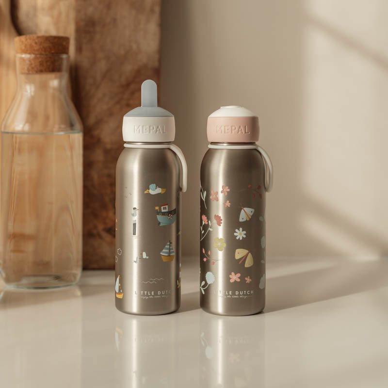 Cool und kühl auf dem Schulhof mit dieser angesagten Thermoflasche Flip-up in Blau. Die Thermoflasche sorgt dafür, dass die Getränke deines Sohnes oder deiner Tochter den ganzen Tag über angenehm kühl bleiben. Die Flasche ist mit einem praktischen Flip-up-Trinksystem ausgestattet, mit dem selbst die kleinsten Kinderhände mühelos umgehen können. Einfach den Ausgießer nach oben drücken und dann trinken! Der Ausgießer ist mit einem Trinkhalm verbunden, der optional auch entfernt werden kann – in diesem Fall muss die Flasche jedoch wie gehabt beim Trinken gekippt werden. Die Trinkflasche ist zudem garantiert auslaufsicher, so kannst du sie bedenkenlos mit in die Schultasche packen. Zum Tragen der Flasche kann auch die praktische Trageschlaufe genutzt werden. Die Flip-up-Flasche kann auch mit erfrischend kühlem (Sprudel-) Wasser, kühler Apfelschorle oder heißen Tee befüllt werden. Wir empfehlen, die Flasche bei kohlensäurehaltigen Getränken ohne Strohhalm zu verwenden. Und was für uns ganz selbstverständlich ist: Die Flasche ist nicht nur BPA-frei, sondern lässt sich auch einfach reinigen. Für möglichst lange Freude an diesem Edelstahlprodukt empfehlen wir die Reinigung per Hand. Der Deckel ist spülmaschinenfest.