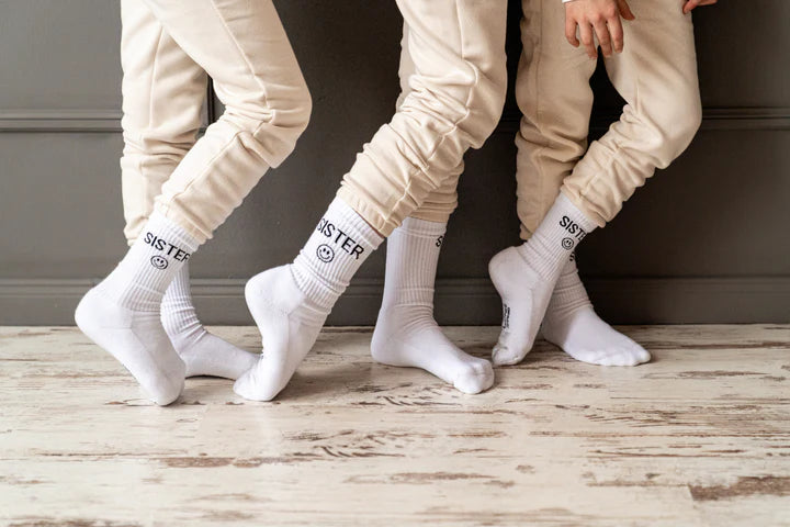 Premiumsocken in weiss aus kuschelig-weicher Bio Baumwolle mit eingewebtem Schriftzug SISTER und einem happy Smiley jeweils an der Außenseite.